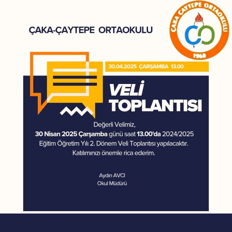 30 Nisan 2025 Çarşamba günü saat:13.00'da 2024-2025 Eğitim-Öğretim yılı 2. Dönem veli toplantısı yapılacaktır. Katılımınızı önemle rica ederim.